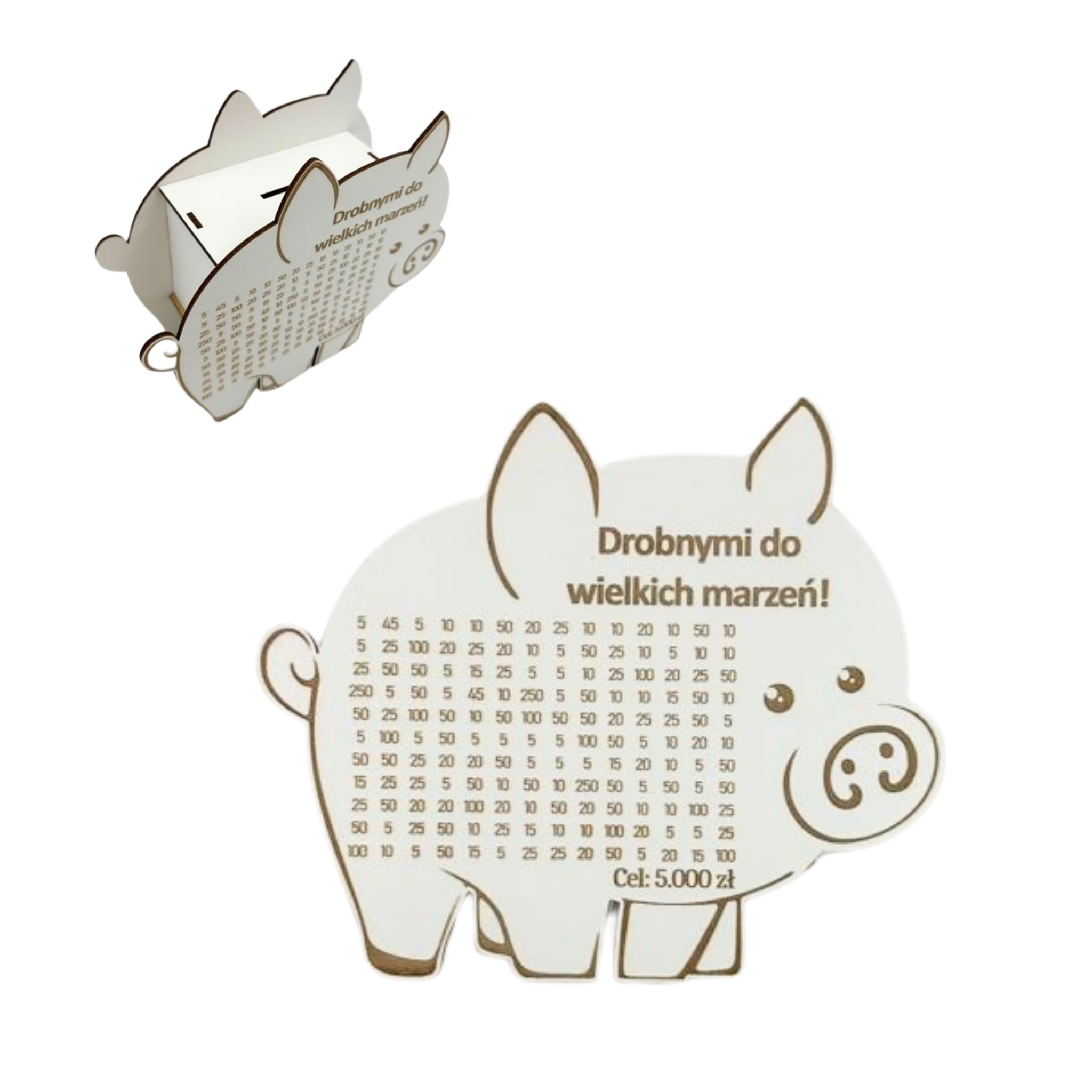 - Wygrawerowana tabelka: Na powierzchni skarbonki znajduje się tabelka, w której można wykreślać kolejne kwoty w miarę dodawania gotówki.