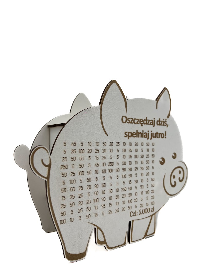 - Wygrawerowana tabelka: Na powierzchni skarbonki znajduje się tabelka, w której można wykreślać kolejne kwoty w miarę dodawania gotówki.