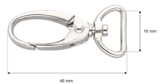 Karabińczyk metalowy typu krab o szerokości 15 mm, wysokości 45 mm i wadze 9,4 g. W powłoce kolorystycznej nikiel połysk. Karabińczyki metalowe to jedne z najbardziej popularnych artykułów kaletniczych. Używa się ich jako mocowania pasków lub zapięcia w torbach i plecakach, a także dodatki do odzieży oraz gadżetów reklamowych i dla zwierząt.
