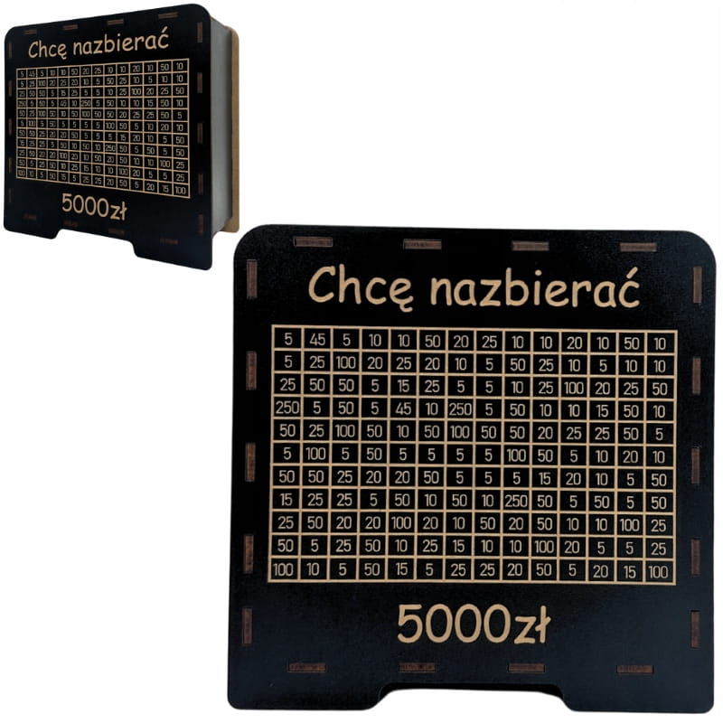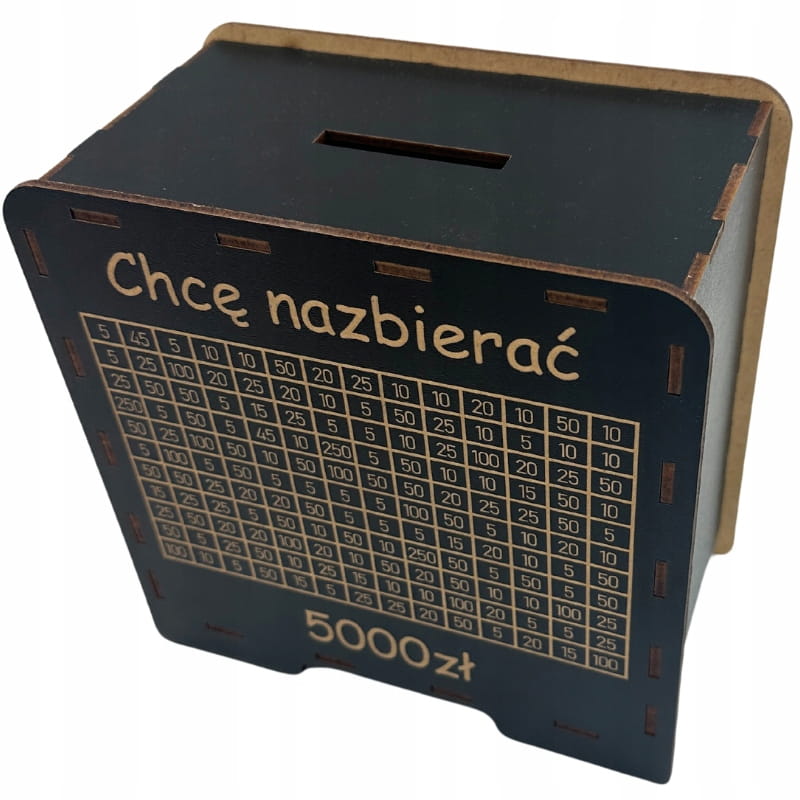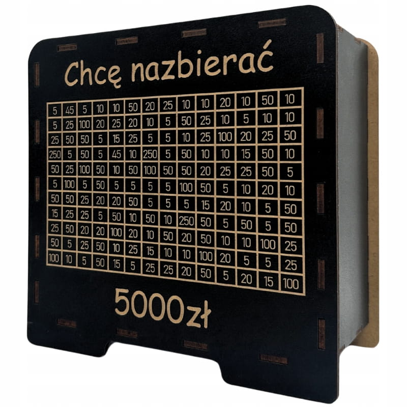 - Wygrawerowana tabelka: Na powierzchni skarbonki znajduje się tabelka, w której można wykreślać kolejne kwoty w miarę dodawania gotówki.
