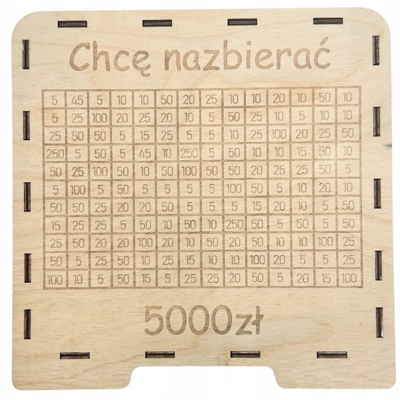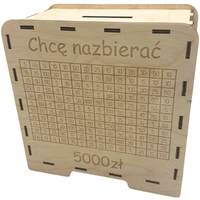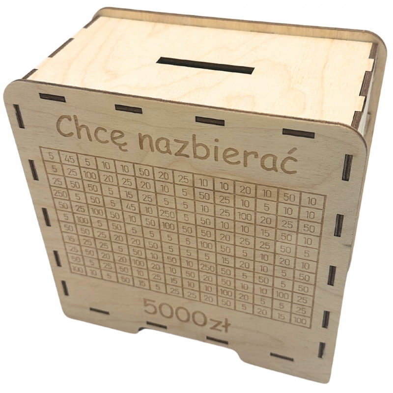 Drewniana skarbonka wykreślanka CHCĘ NAZBIERAĆ 5000 ZŁ drewno