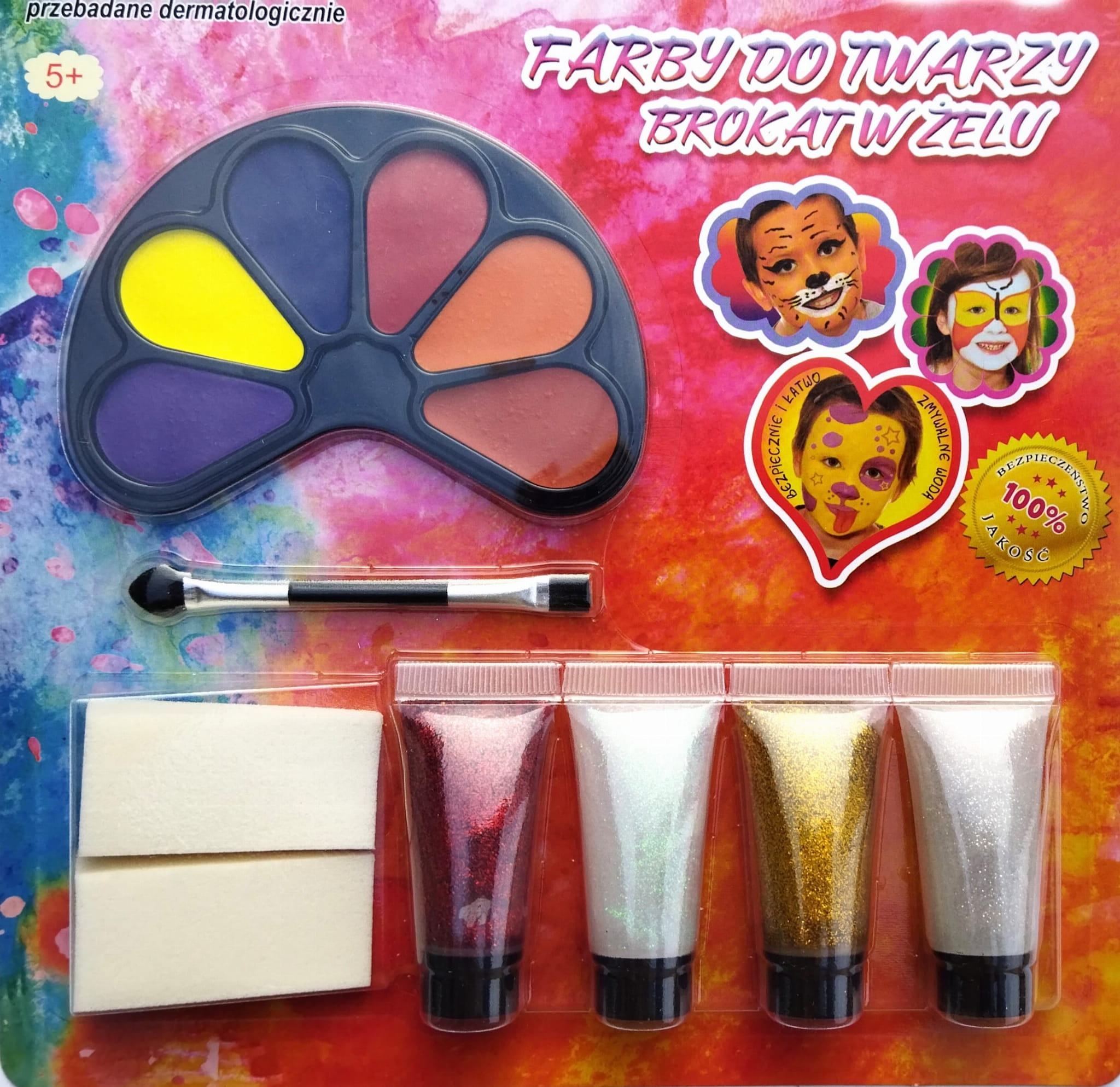 - w zestawie 6 kolorów farb i 4 kolory brokatu w żelu