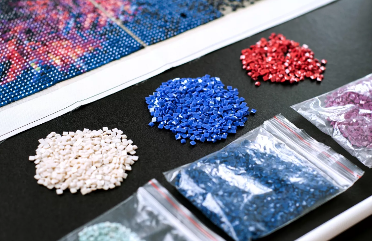 - diamenciki o różnych kolorach, które są posegregowane w ponumerowane i oznaczone odpowiednimi symbolami woreczki