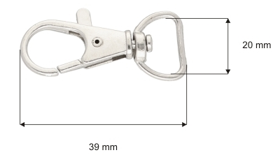 Karabińczyk metalowy typu rybka o szerokości 20 mm, wysokości 39 mm i wadze 3,6 g. W powłoce kolorystycznej nikiel, lekki. Karabińczyki metalowe to jedne z najbardziej popularnych artykułów kaletniczych. Używa się ich jako mocowania pasków lub zapięcia w torbach i plecakach, a także dodatki do odzieży oraz gadżetów reklamowych i dla zwierząt.