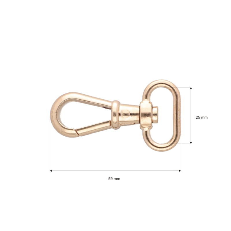 Karabińczyk metalowy o szerokości 25 mm, wysokości 60 mm i wadze 22,5 g. W powłoce kolorystycznej jasne złoto.