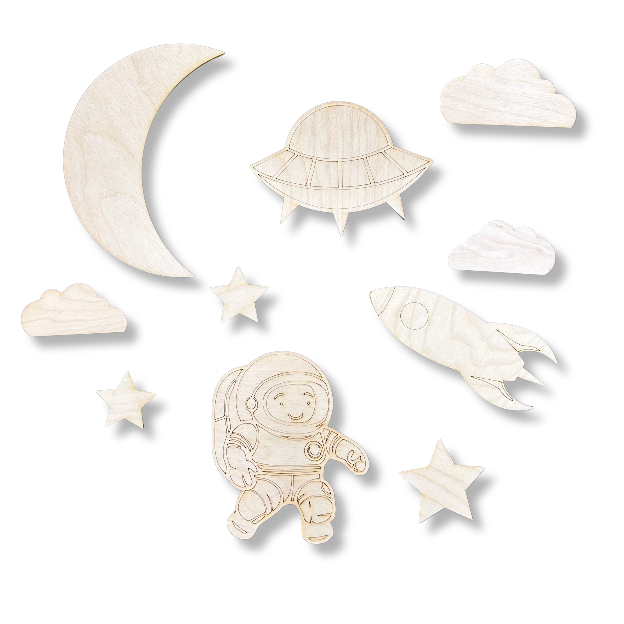 - wymiary poszczególnych elementów: księżyc -19,6 x 6,7 cm, astronauta – 16 cm x 13,2 cm, statek kosmiczny – 15,8 cm x 11,5 cm, rakieta – 16, 8 cm x 6,8 cm, chmury – 10,5 cm x 5,6 cm, 8,8 cm x 4,3 cm, gwiazdy – 7cm, 5 cm