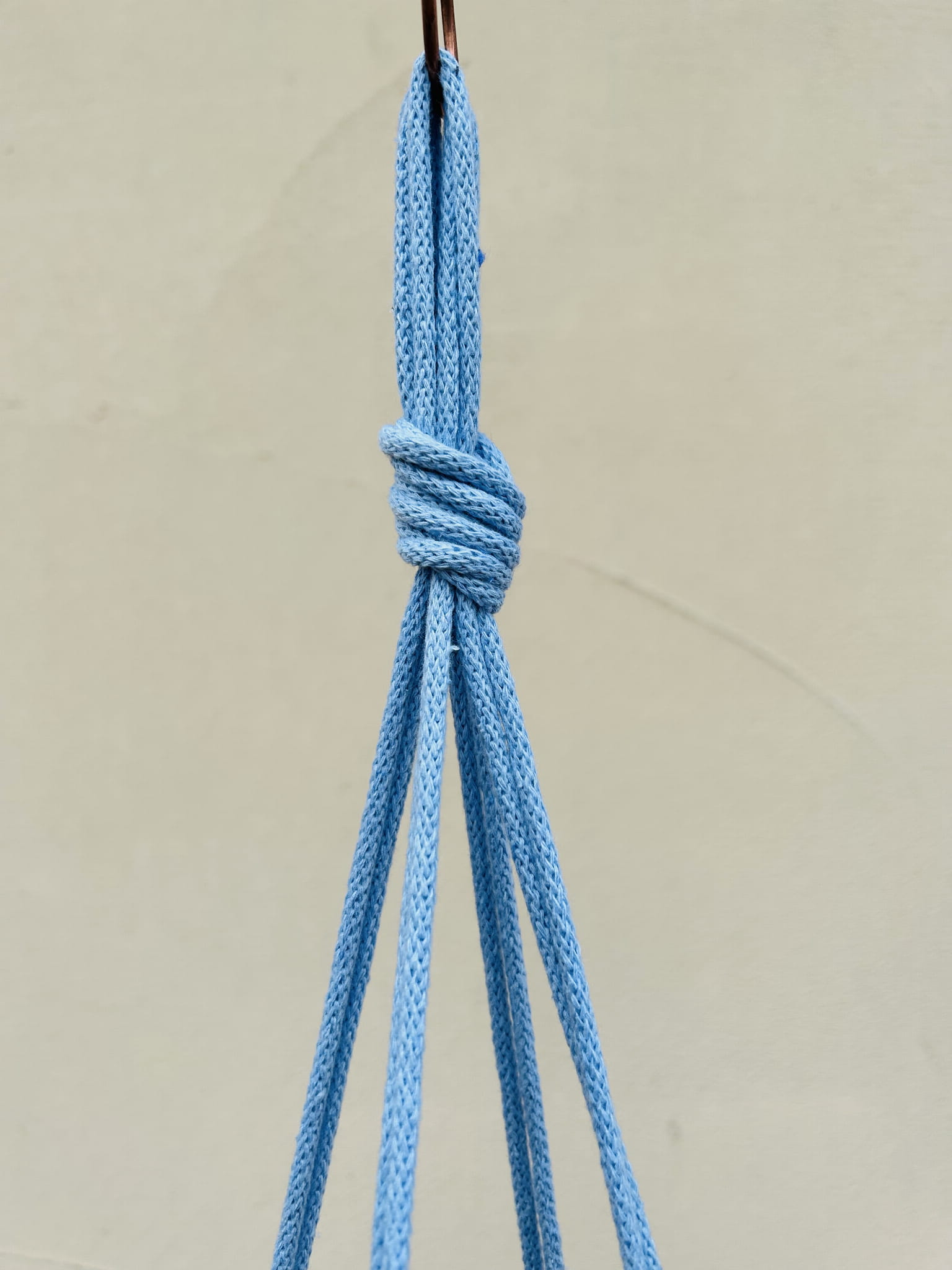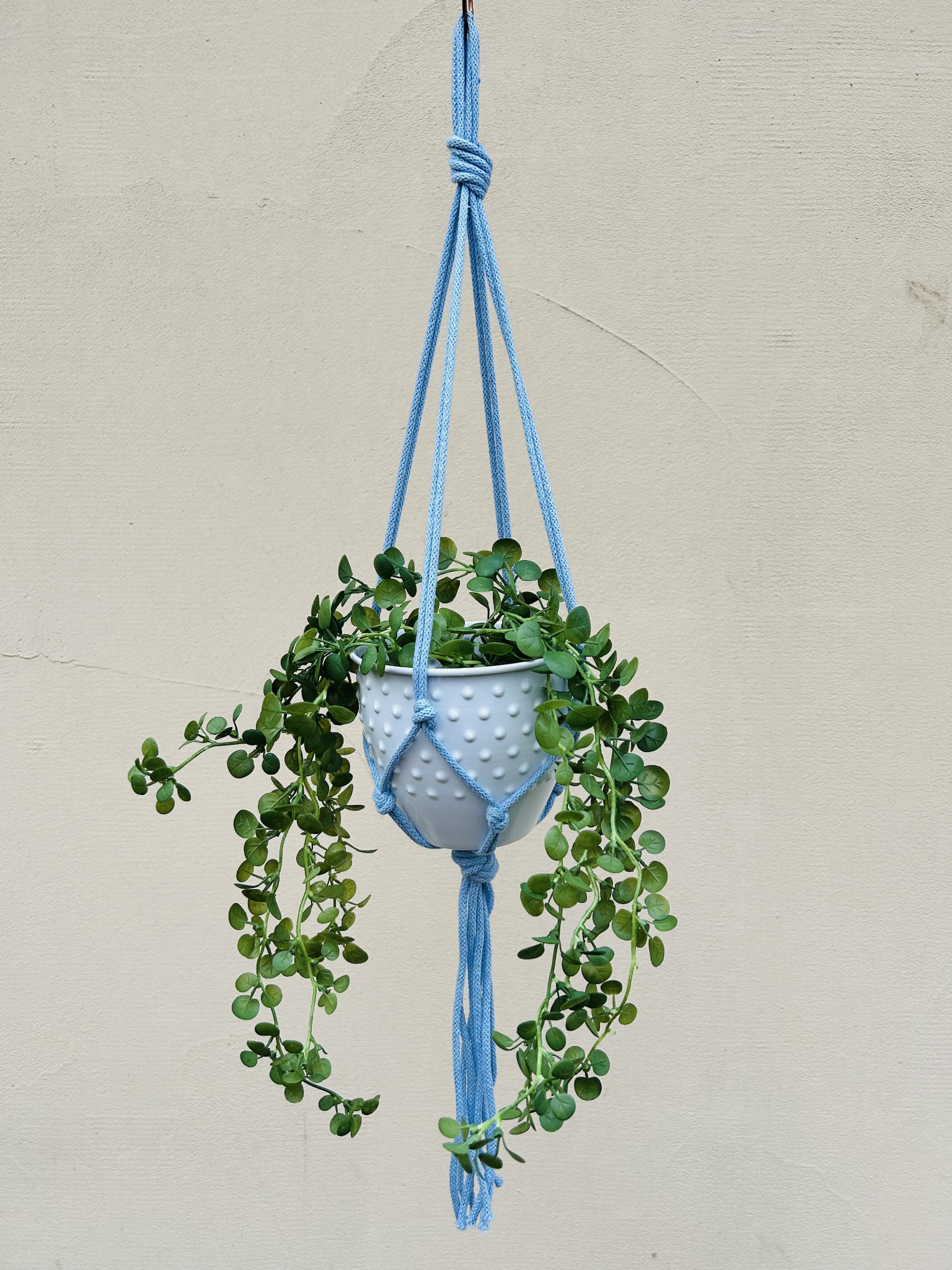 Kwietnik wiszący makrama. Wykonany ręcznie ze sznurka bawełnianego 5mm w kolorze niebieskim.