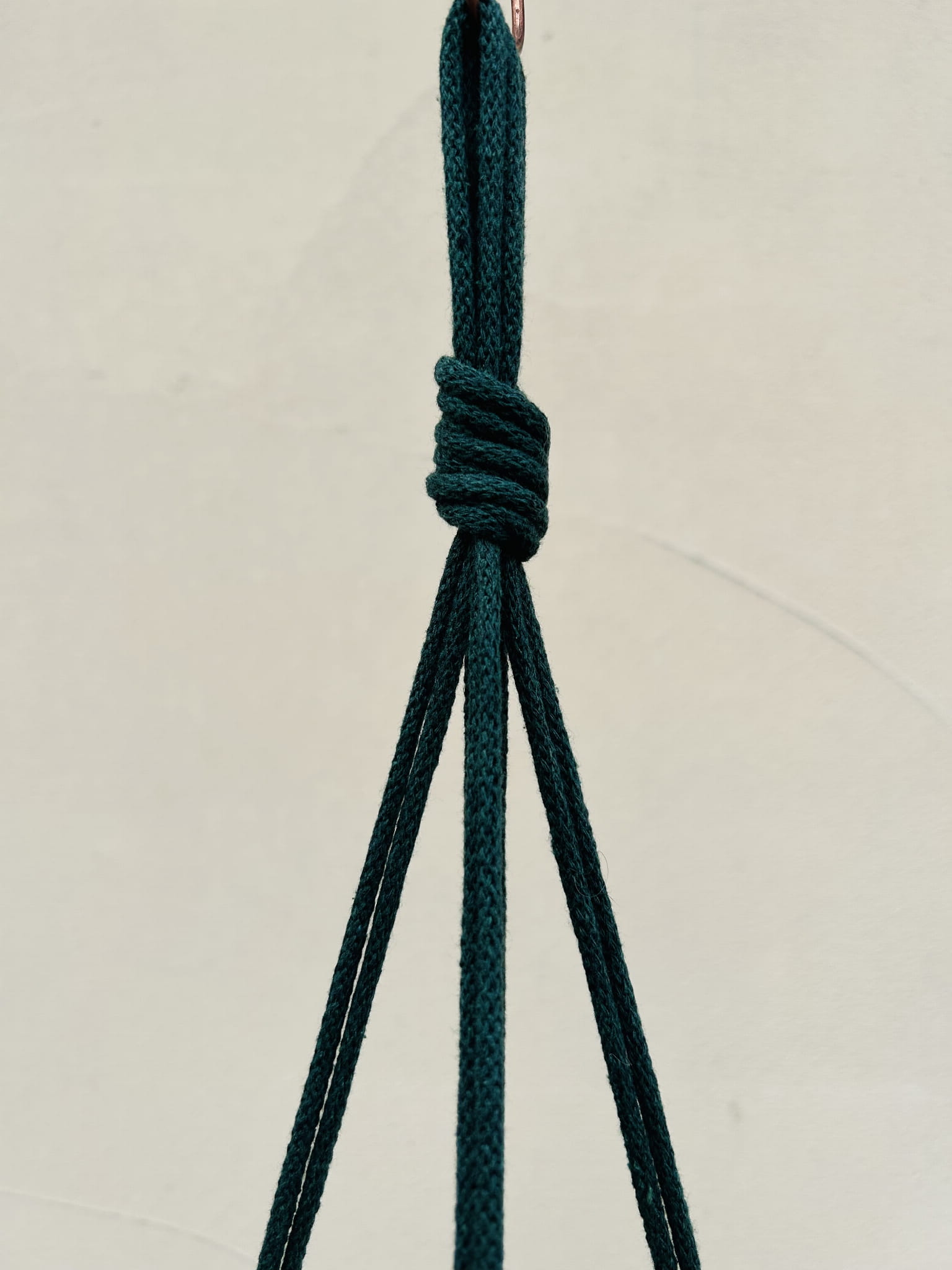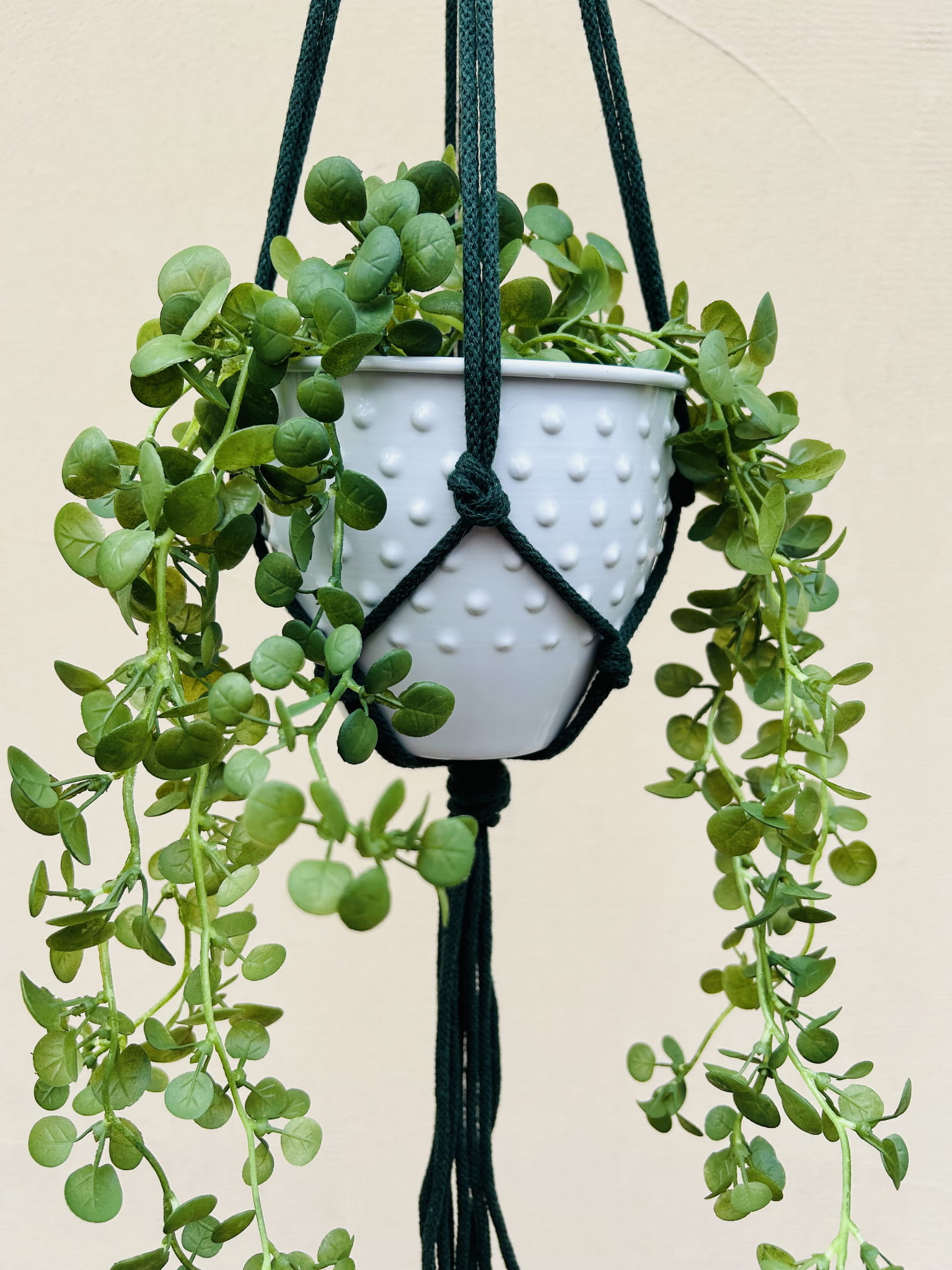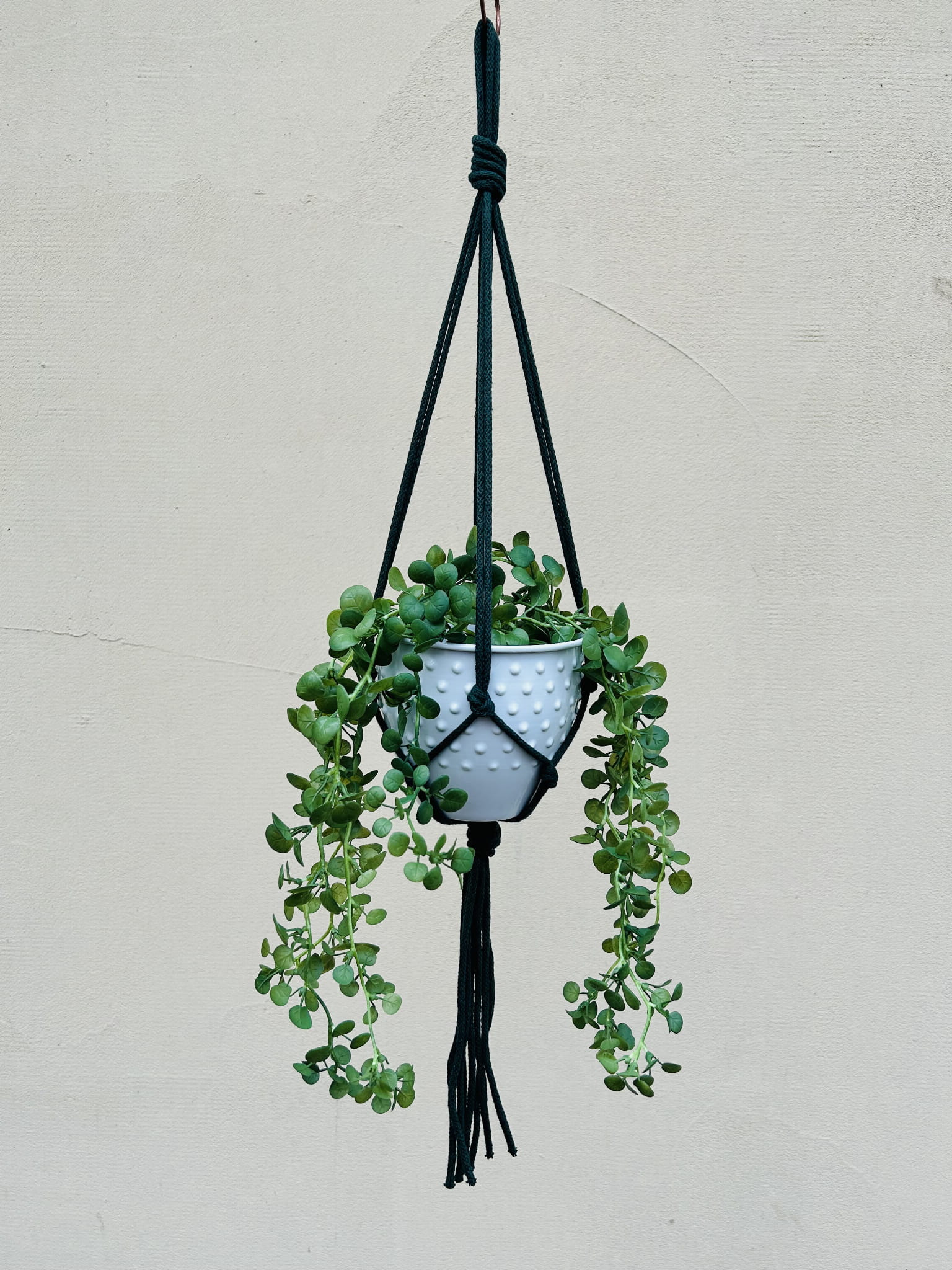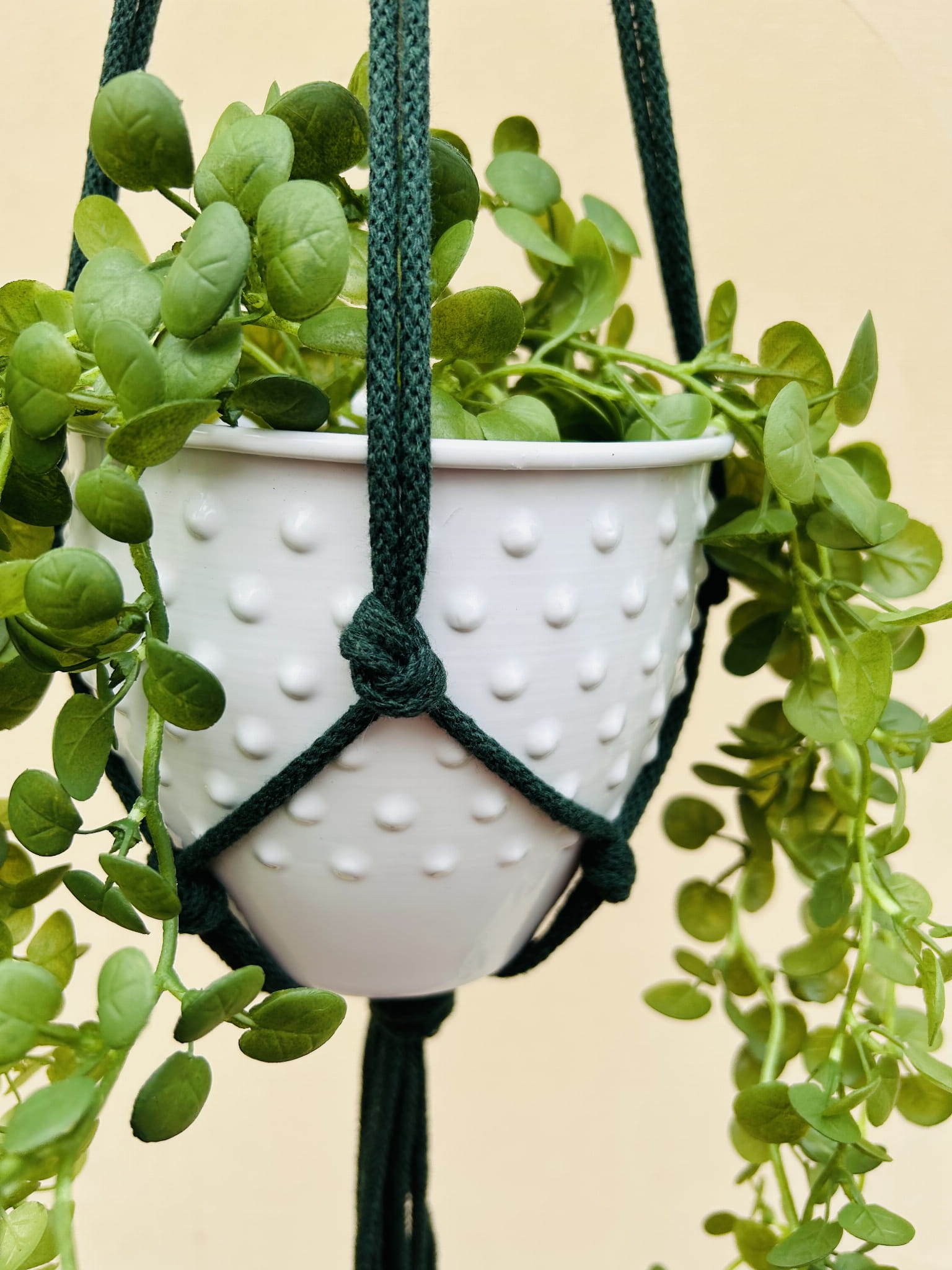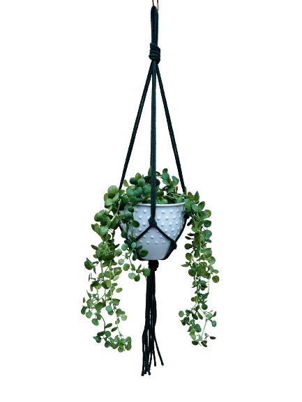 Kwietnik wiszący makrama. Wykonany ręcznie ze sznurka bawełnianego 5mm w kolorze butelkowej zieleni.