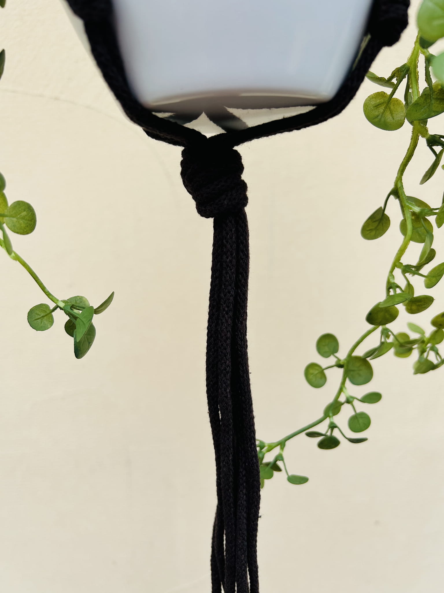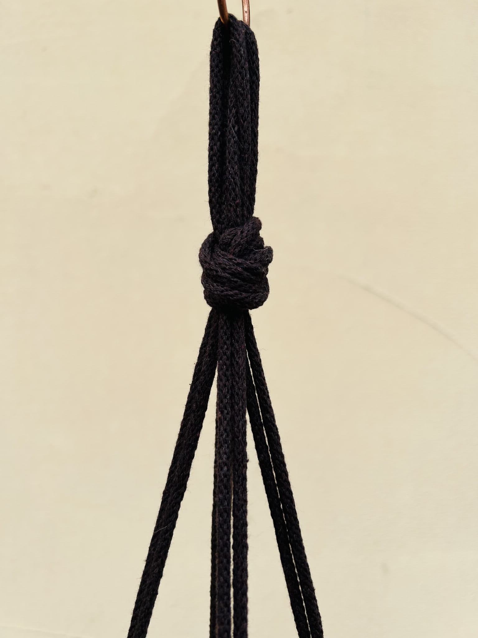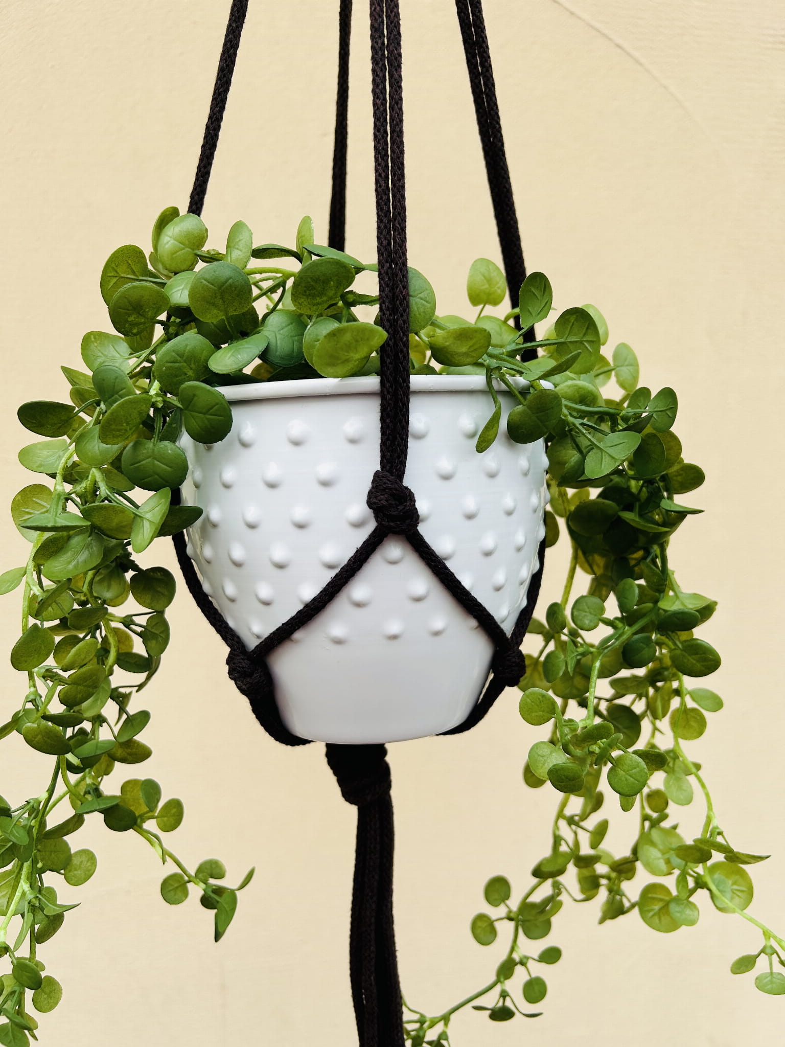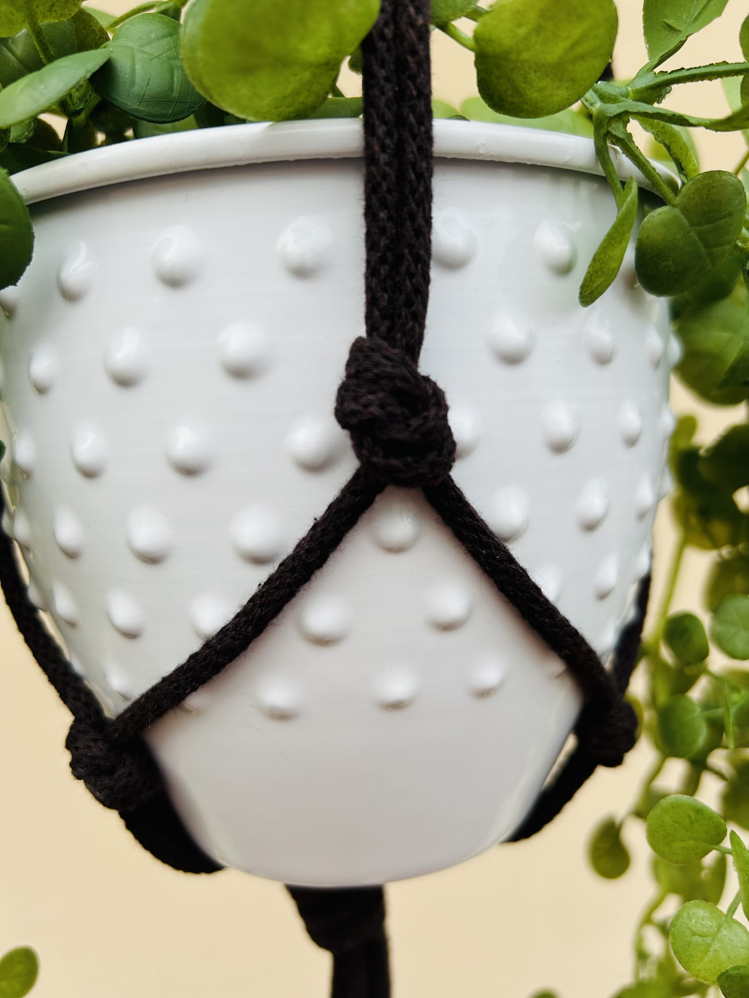 Kwietnik wiszący makrama. Wykonany ręcznie ze sznurka bawełnianego 5mm w kolorze ciemnego brązu.
