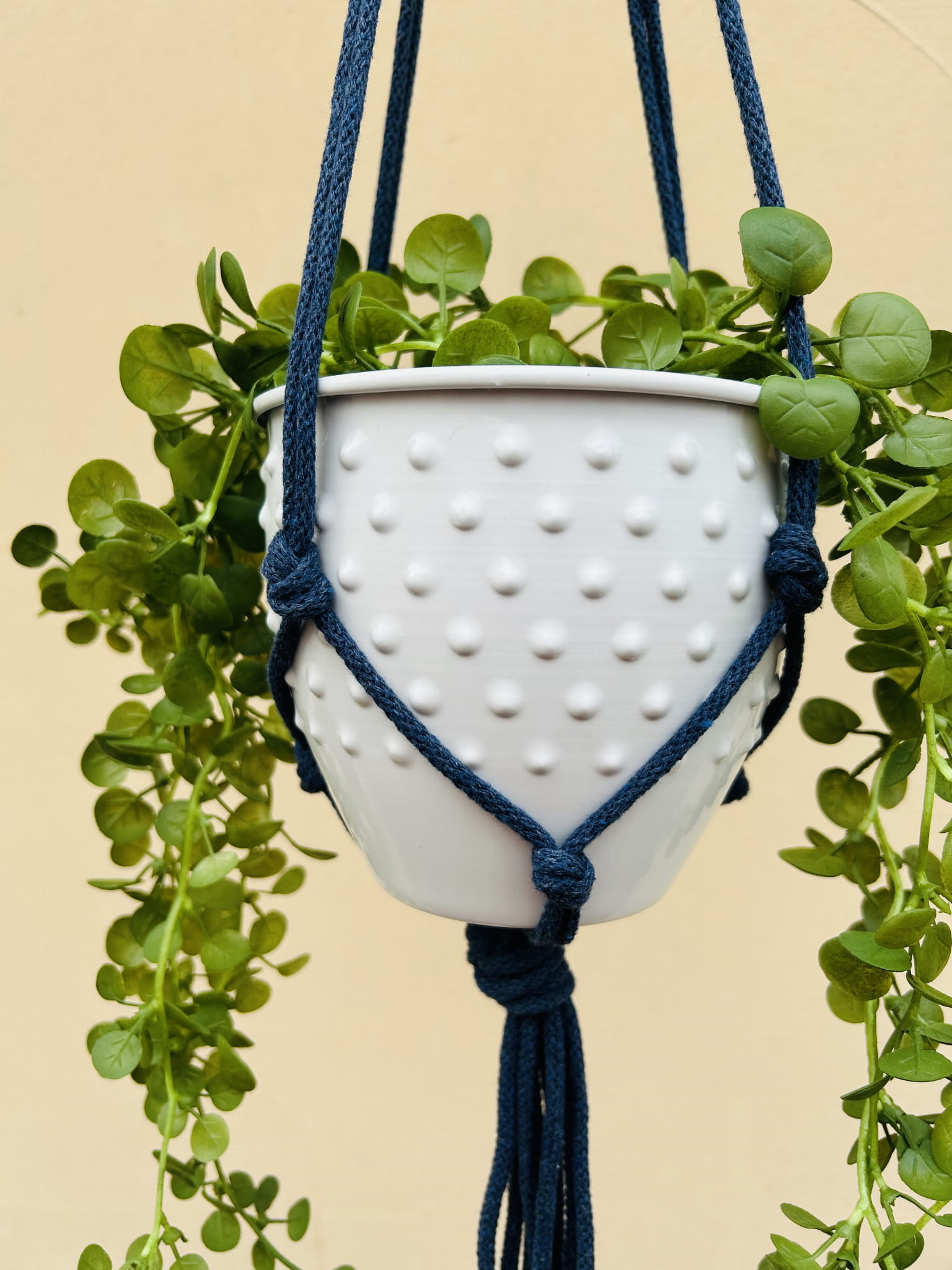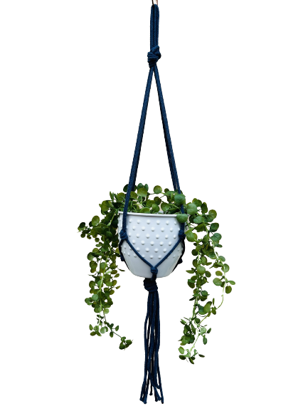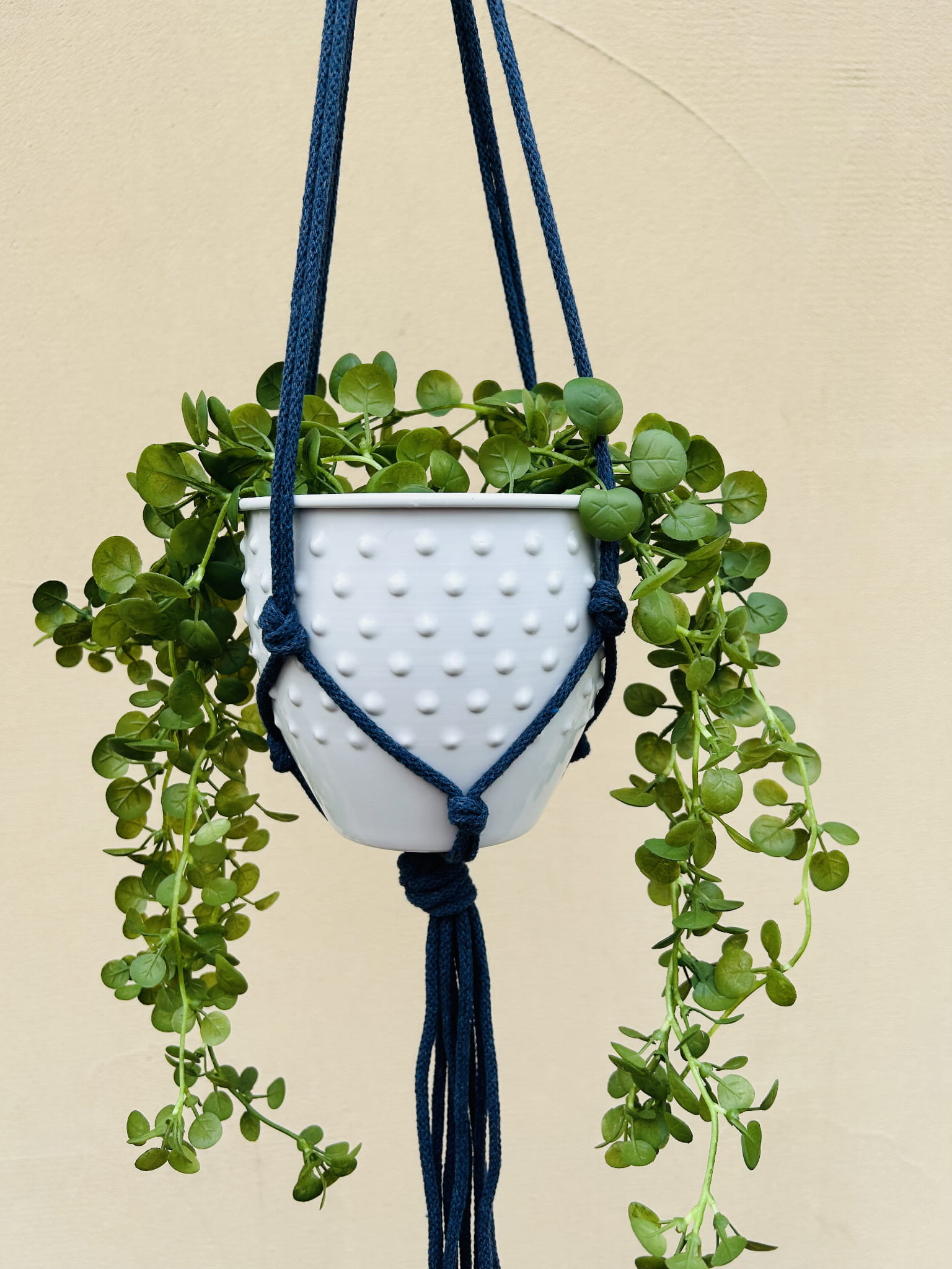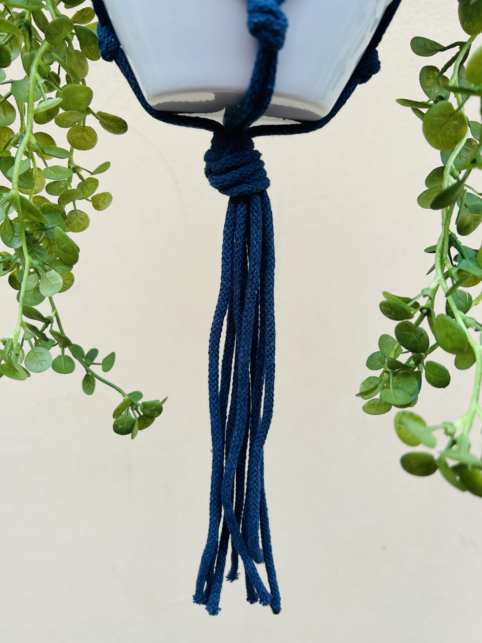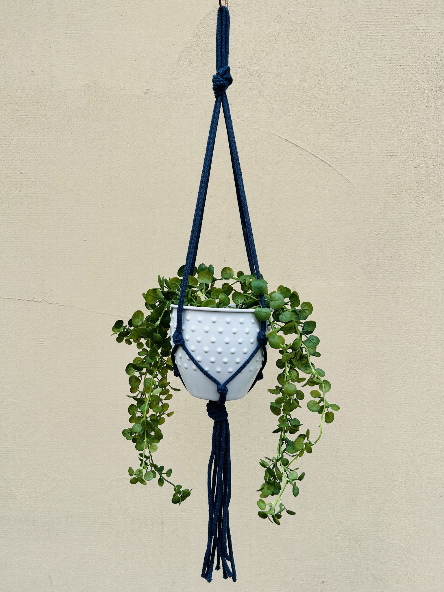 Kwietnik wiszący makrama. Wykonany ręcznie ze sznurka bawełnianego 5mm w kolorze jeansowym.