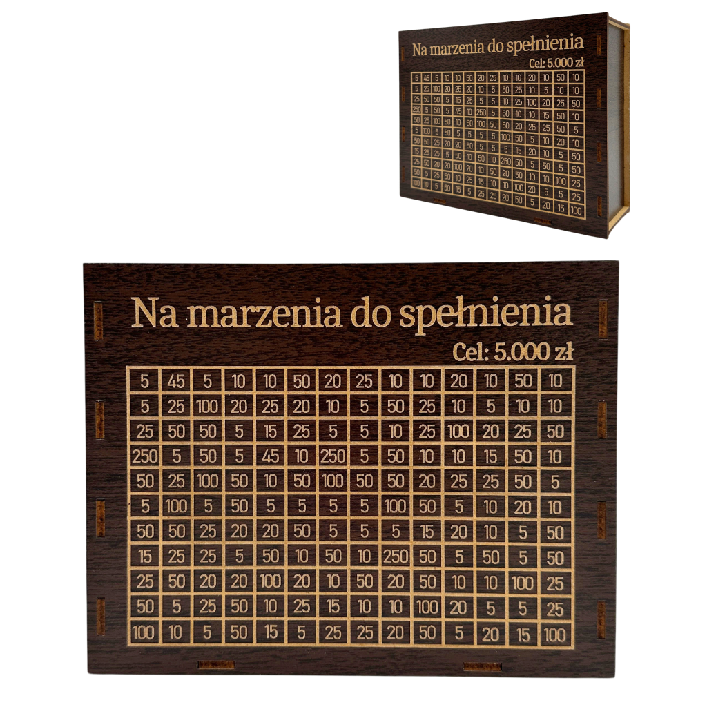 - Personalizacja: Możliwość wygrawerowania dowolnego celu oszczędzania, np. „Na wakacje marzeń”, „Na wesele”, „Na edukację”, czy „Spełnienia marzeń!”.