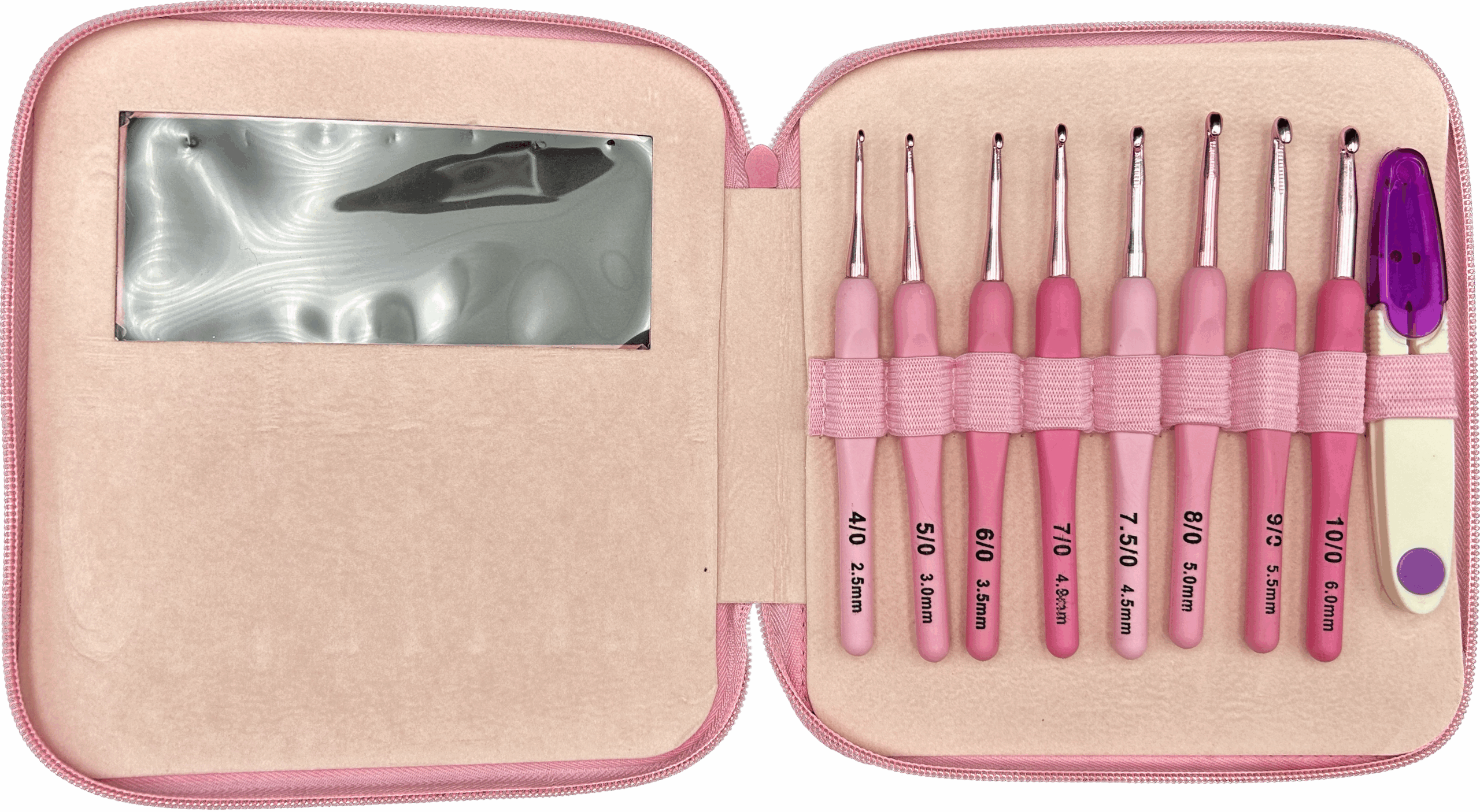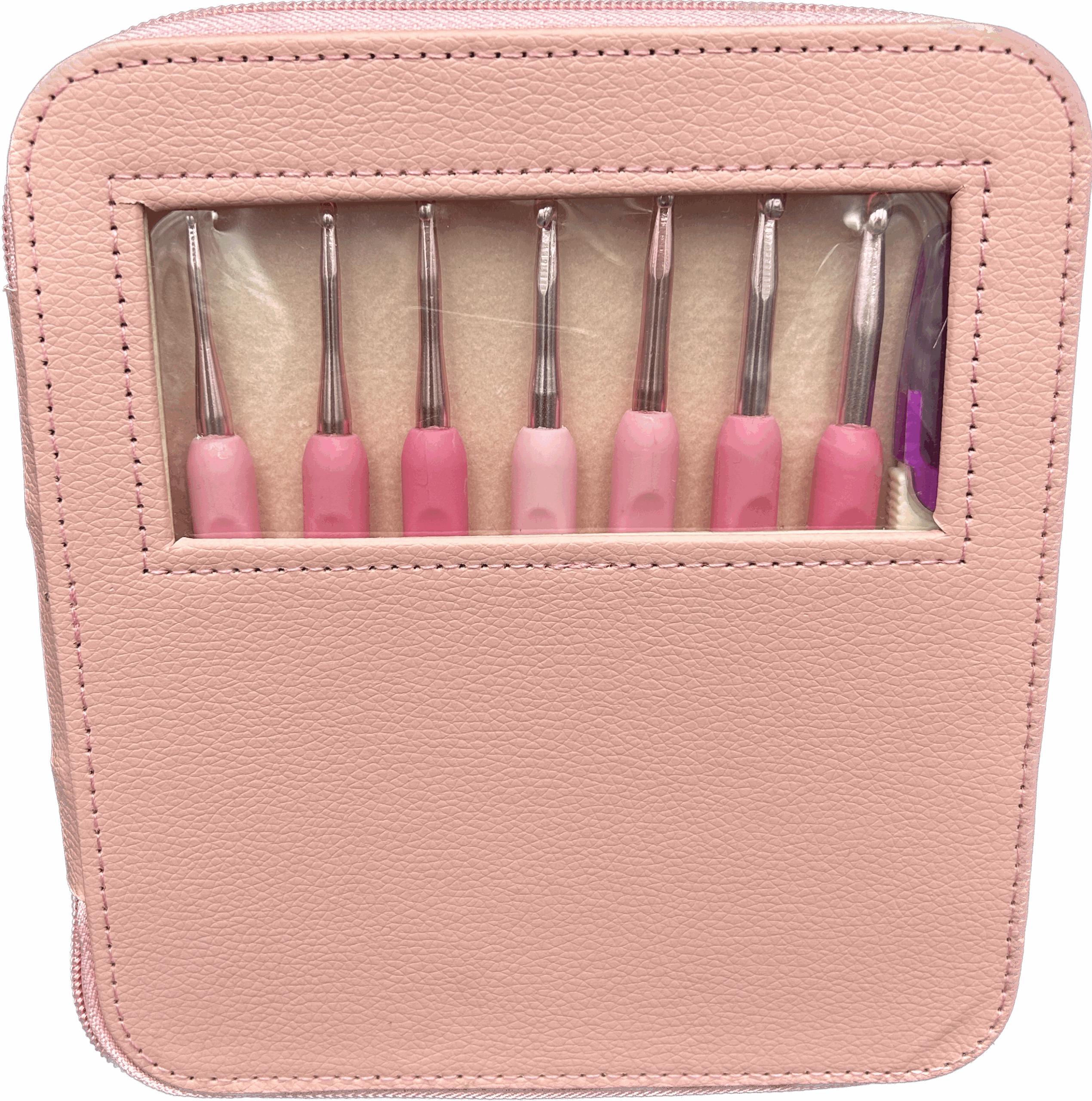 Zestaw różowych szydełek w piórniku + obcinaczki
