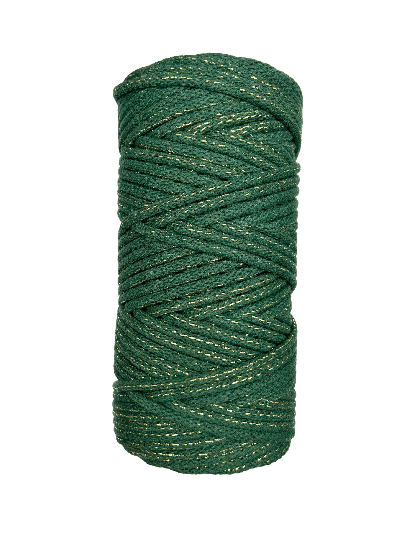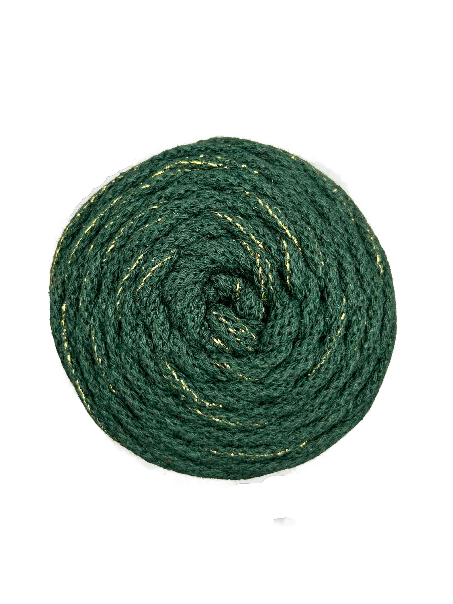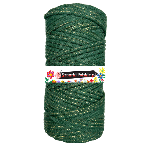 Sznurek bawełniany w kolorze butelkowej zieleni ze złotą nicią.
