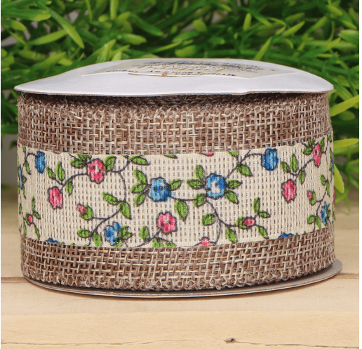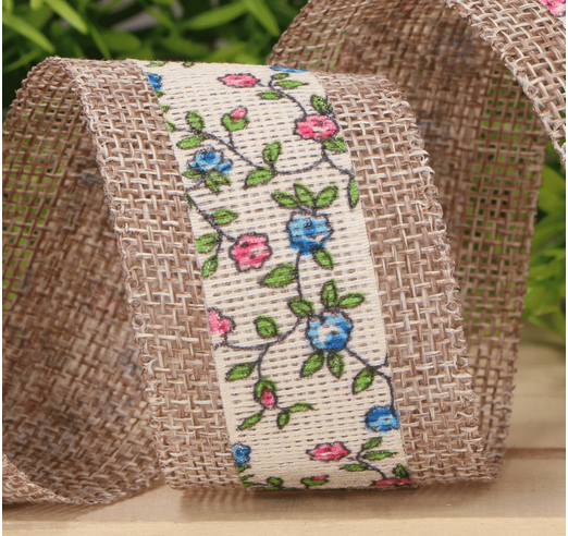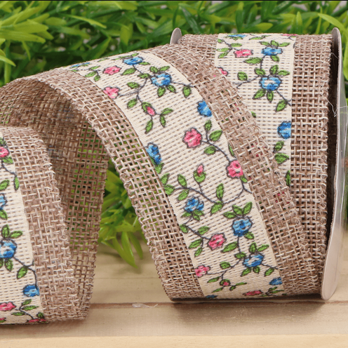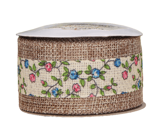 Wstążka jutowa w kwiaty niebieski, róż 3,8cm 4,5m