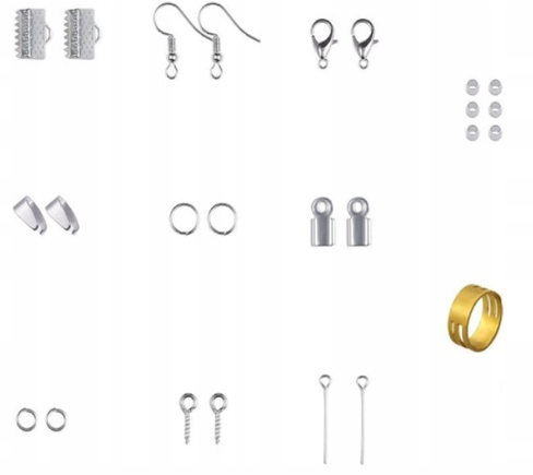 Zestaw półfabrykatów w wygodne pudełko z przegródkami. Do zestawu dołączone są wszystkie potrzebne narzędzia do tworzenia biżuterii: pierścień do precyzyjnego wyginania elementów, pęseta, szczypce.