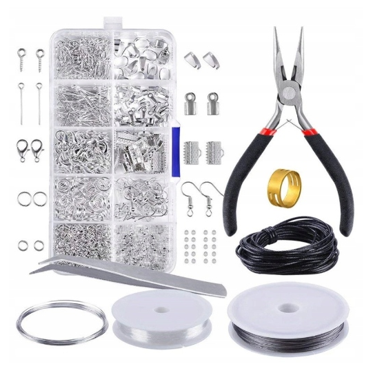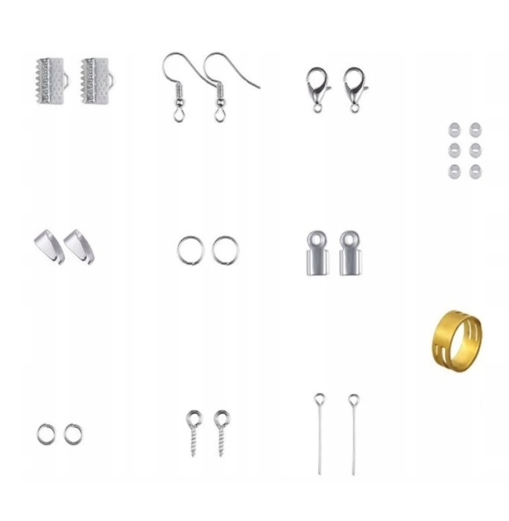 Zestaw półfabrykatów w wygodne pudełko z przegródkami. Do zestawu dołączone są wszystkie potrzebne narzędzia do tworzenia biżuterii: pierścień do precyzyjnego wyginania elementów, pęseta, szczypce.